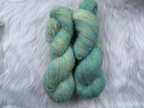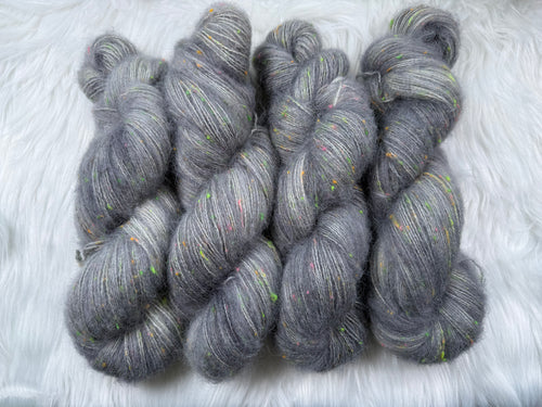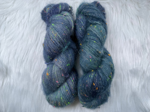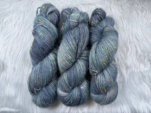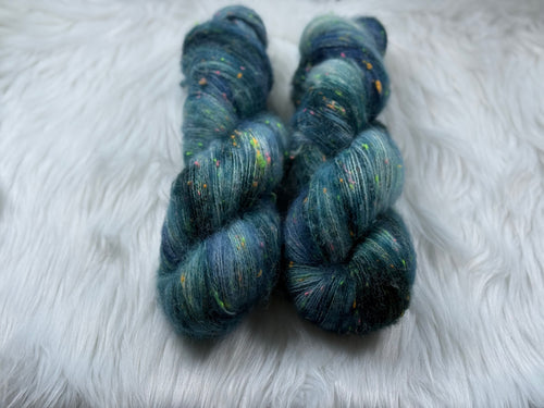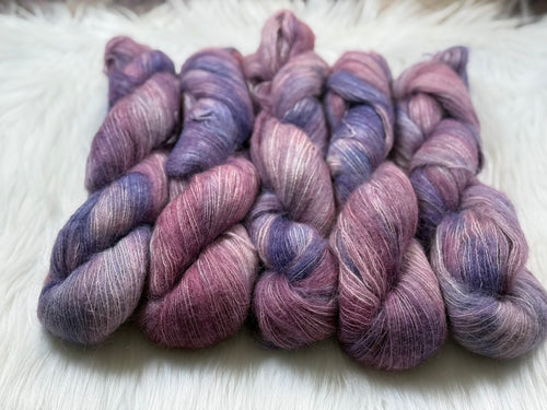 This kit includes one skein each of Luxe Silky or Sock Marl (400yds/386m) and Suri Silk Fluff (437yds/400m), and a pattern download code (sent via email).