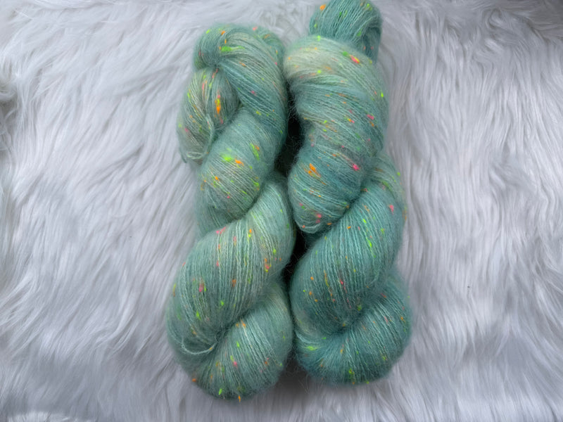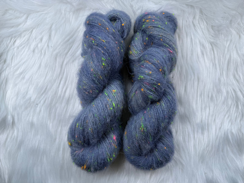 Bright black-light reactive neon Donegal neps are scattered throughout like tiny pops of confetti, glowing vividly under UV light while adding playful contrast in everyday wear. The result is a yarn that feels grounded and wearable, yet unmistakably fun — full of personality without sacrificing comfort.